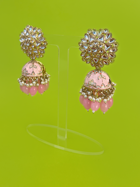 Baby Pink Hand-Painted Gold-Plated Kundan Jhoomka