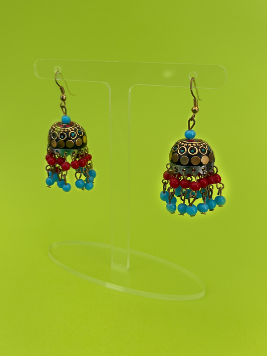 Multicolured Gold-Plated Jhoomka with Blue and Red Beads