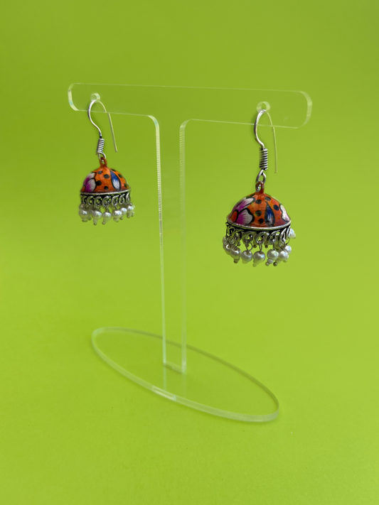 Orange and Blue Hand-Painted Meenakari Jhoomka with Hook