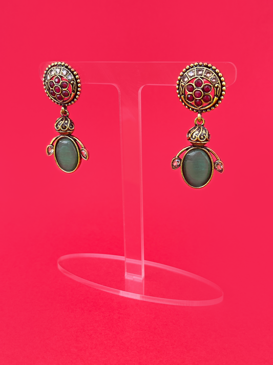 Flower-Design Gold-Plated Earring with Red and Green Stones