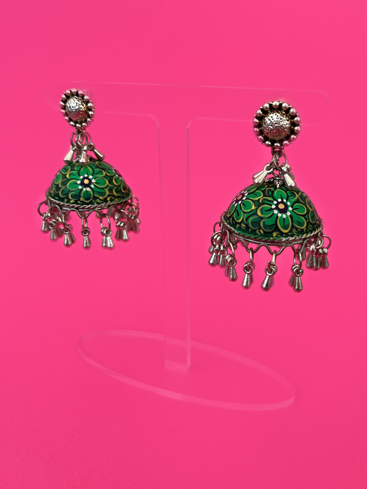 Green Flower-Design Hand-Painted Silver-Plated Jhoomka