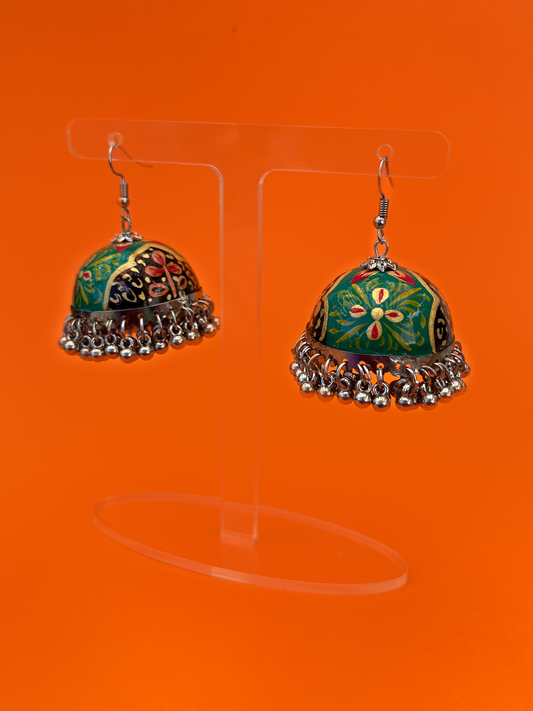 Green, Brown and Gold Hand-Painted Silver-Plated Jhoomka