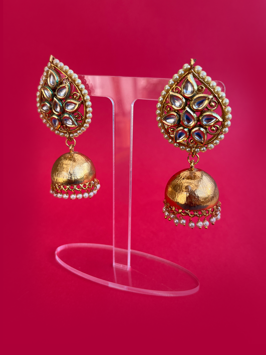 Gold-Plated Teardrop Kundan Jhoomka with Diamantés and Pearls
