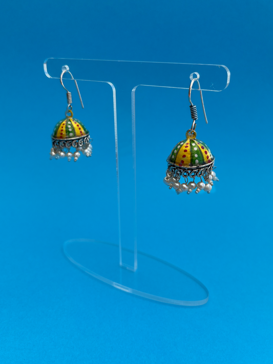 Green and Yellow Hand-Painted Meenakari Jhoomka with Hook