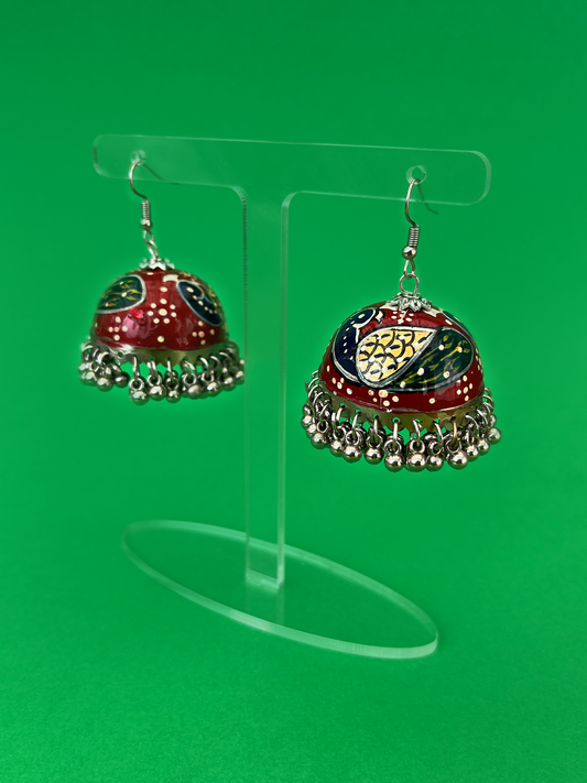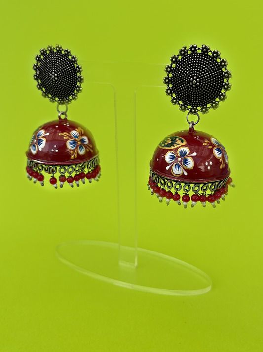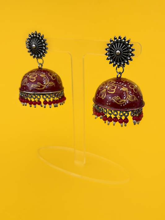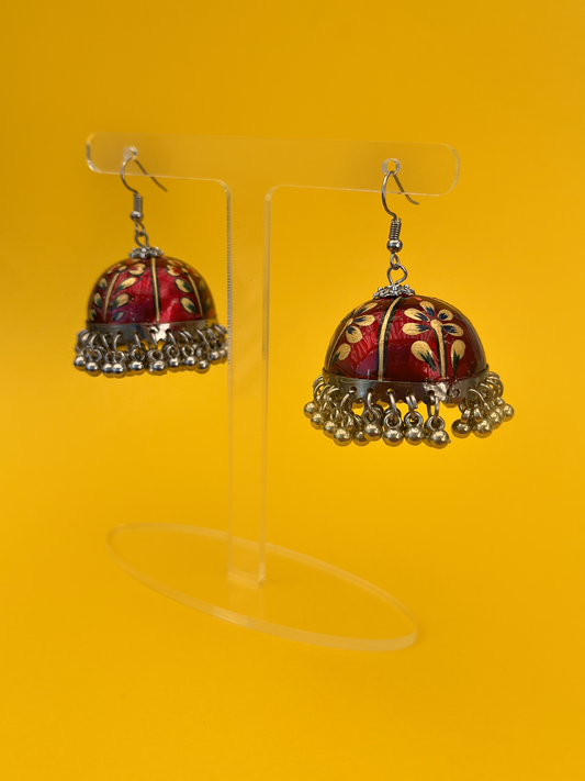 Maroon and Gold Hand-Painted Silver-Plated Jhoomka