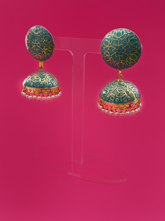 Maroon and Blue Hand-Painted Gold-Plated Meenakari Jhoomka