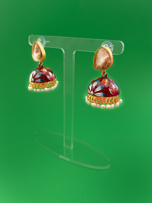 Maroon Hand-Painted Meenakari Jhoomka with Gold Flowers