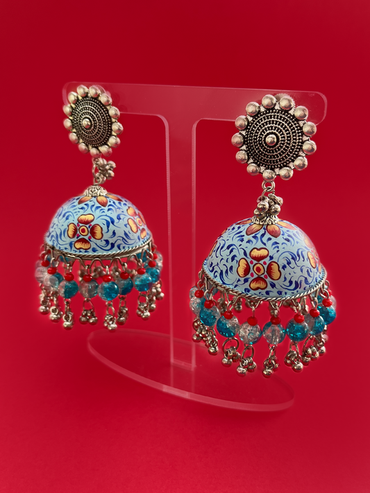 Light Blue and Gold Hand-Painted Jhoomka with Blue and Red Beads