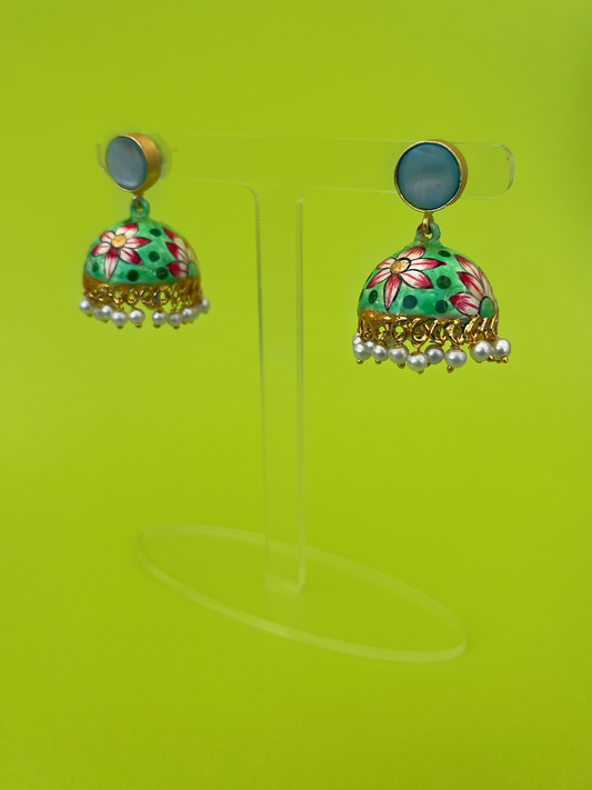 Light Green Lily-Design Hand-Painted Gold-Plated Jhoomka