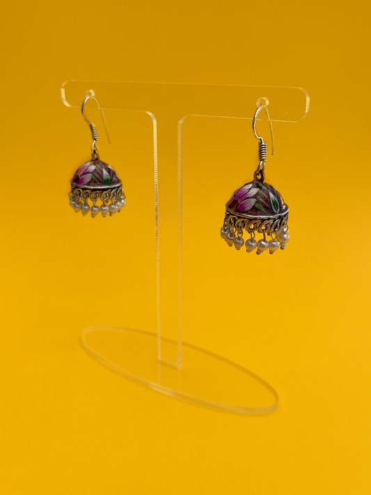 Maroon, Purple and Green Hand-Painted Meenakari Jhoomka with Hook