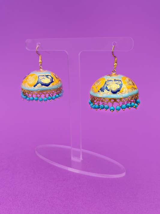 Blue and Yellow Painted Gold-Plated Meenakari Jhoomka with Blue Beads and Hook