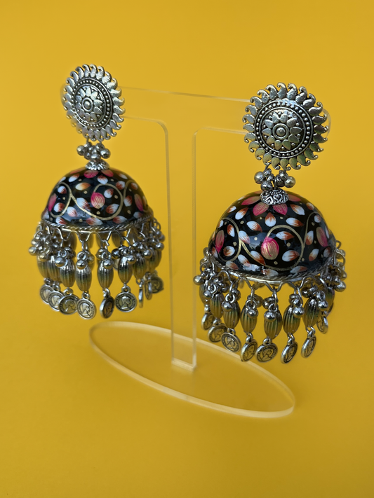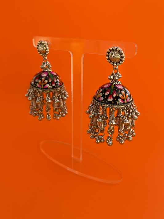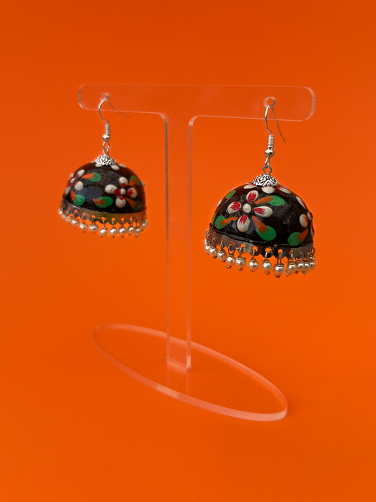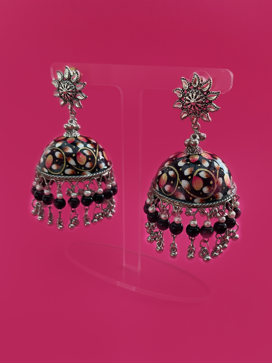 Black Hand-Painted Flower Jhoomka with Assorted Beads