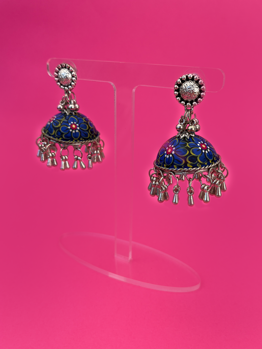 Blue and Yellow Hand-Painted Silver-Plated Jhoomka