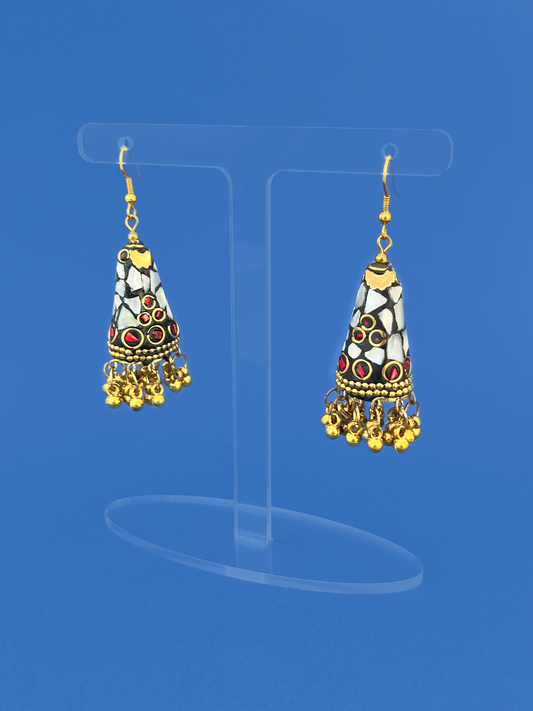 Mother of Pearl Stone Gold-Plated Meenakari Jhoomka with Gold Beads