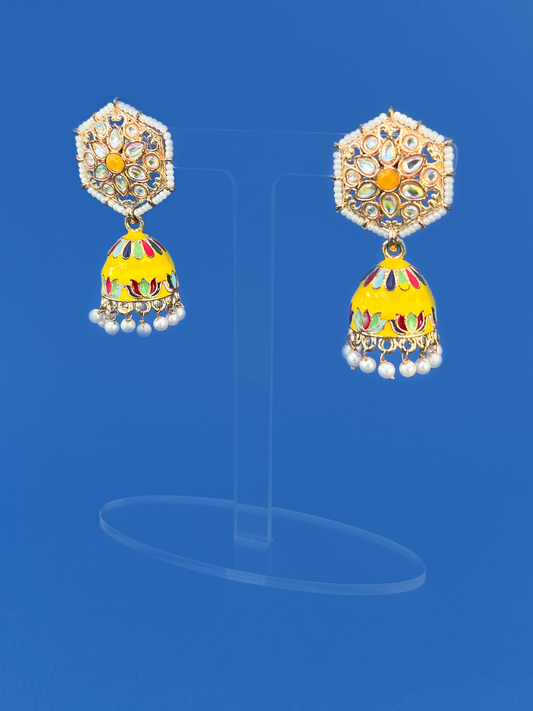 Yellow Hand-Painted Gold-Plated Kundan Jhoomka