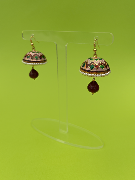 Salmon Pink, Maroon and Green Meenakari Jhoomka with Garnet Red Stone and Hook