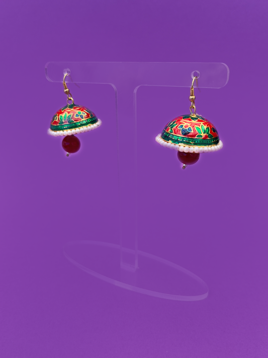 Red and Green Meenakari Jhoomka with Red Stone and Hook